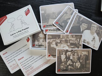 Dat is precies wat de gesprekskaarten in streektaal doen. Op de twintig kaarten staan alledaagse onderwerpen, zoals gezin, huisdieren, mijlpalen, werk, hobby’s, enzovoort. Daarbij staat een streekeigen foto en een aantal vragen in streektaal. Door de vragen voor te lezen, kunnen zorgmedewerkers en cliënten gemakkelijker samen an de praot in ’t plat.