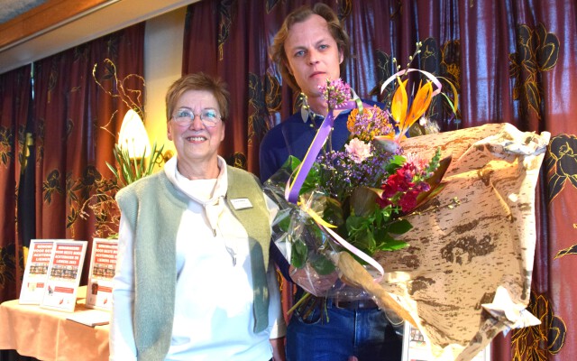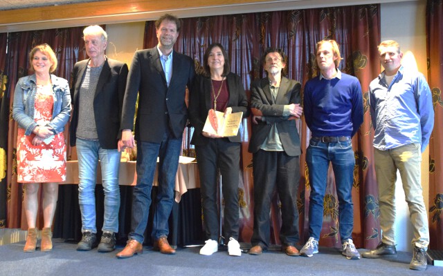 Schrijfster Frederieke Jeletich-Visser ontving het Beste Boek-beeldje uit handen van juryvoorzitter Gerwin Nijkamp.